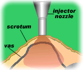 Due to advances in technology the anaesthetic is now delivered using a pressure jet injection instrument which uses a nozzle to pass the anaesthetic through the scrotum directly to the vas. This eliminates the necessity for two anaesthetic injections, one for each vas. Another advantage of this method is the more rapid onset of the effect of the anaesthetic, 10 - 20 seconds as opposed to 2 - 3 minutes using a needle.